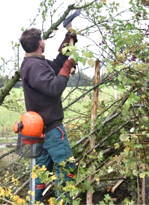 By selecting suitable stems to leave when laying, you establish new young trees with no financial cost. Trees may have developed naturally in the hedge to be laid or have been planted along with the hedge if a hedge is being laid for the first time. These trees, by the nature of how they have grown up with the hedge, will often have a great shape naturally and need little work to become a great hedgerow tree.